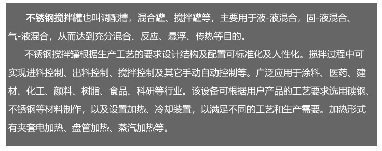 產(chǎn)品概述:不銹鋼液體攪拌罐也叫調(diào)配槽、混合罐、攪拌罐等,主要用于液-液混合,固-液混合、氣-液混合,從而達到充分混合、反應(yīng)、懸浮、傳熱等目的。不銹鋼攪拌罐根據(jù)生產(chǎn)工藝的要求設(shè)計結(jié)構(gòu)及配置可標(biāo)準(zhǔn)化及人性化。攪拌過程中可實現(xiàn)進料控制、出料控制、攪拌控制及其它手動自動控…